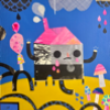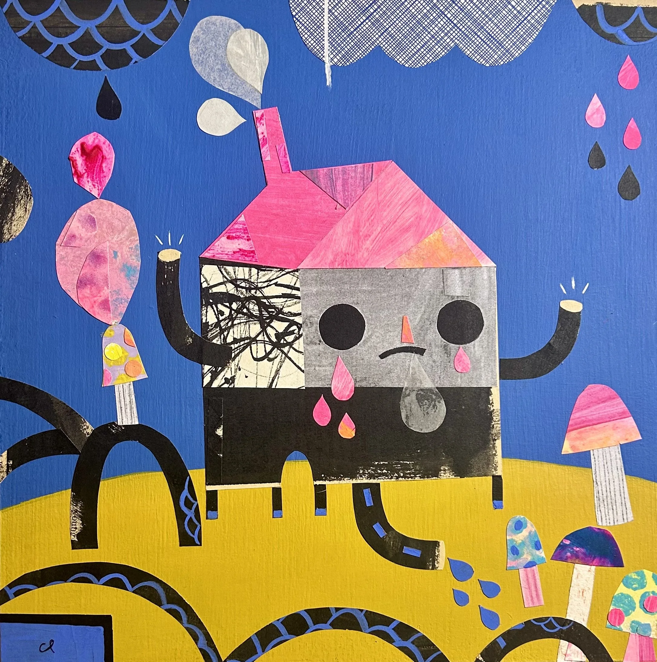 Artwork of a sad house character with a pink roof, black and gray body, and sad face with tears, set against a colorful background with mushrooms, clouds, and raindrops